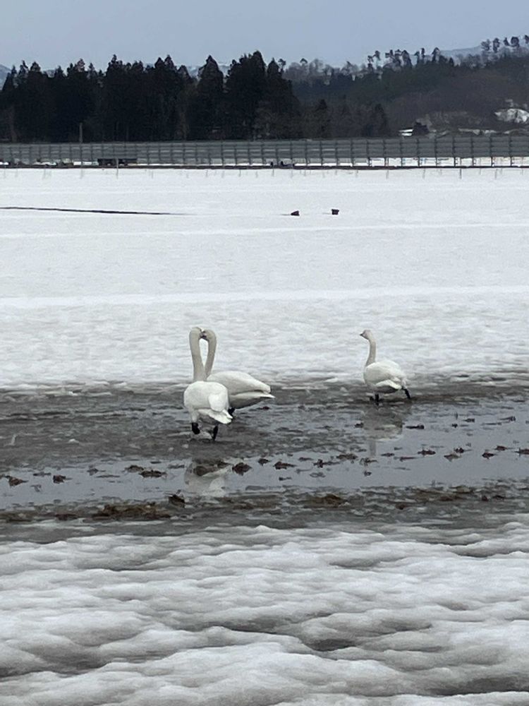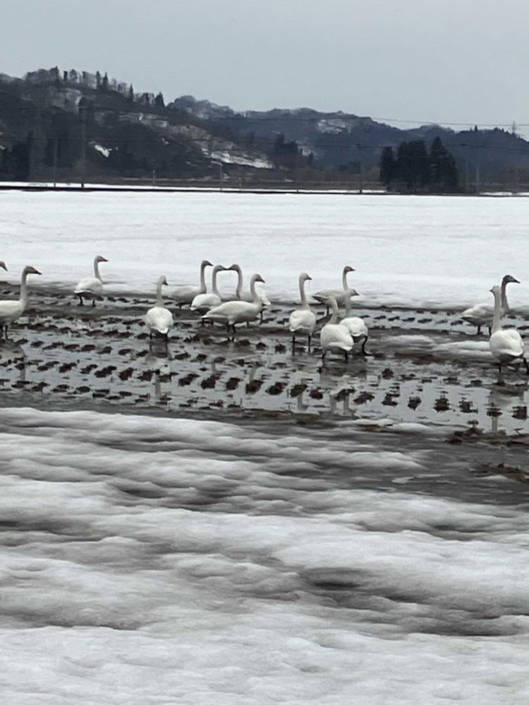 雪溶けの田んぼに沢山の白鳥🦢が落ち穂を食べていました