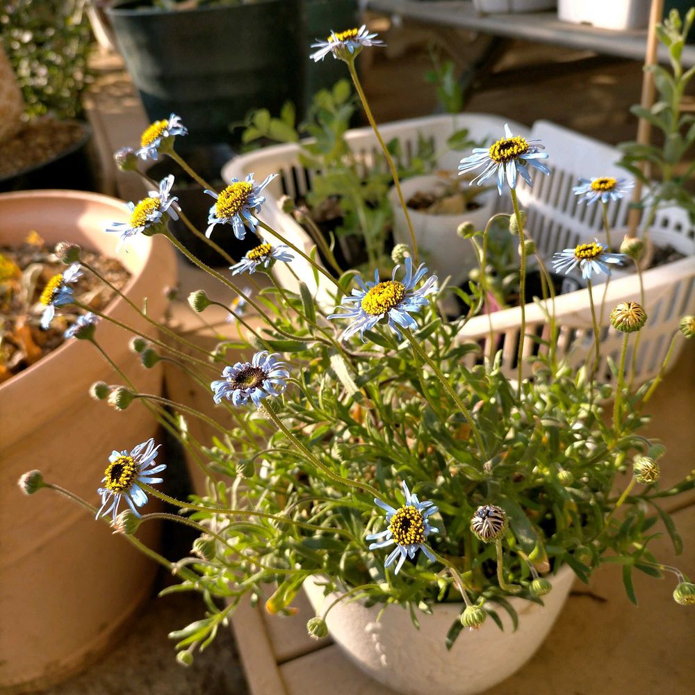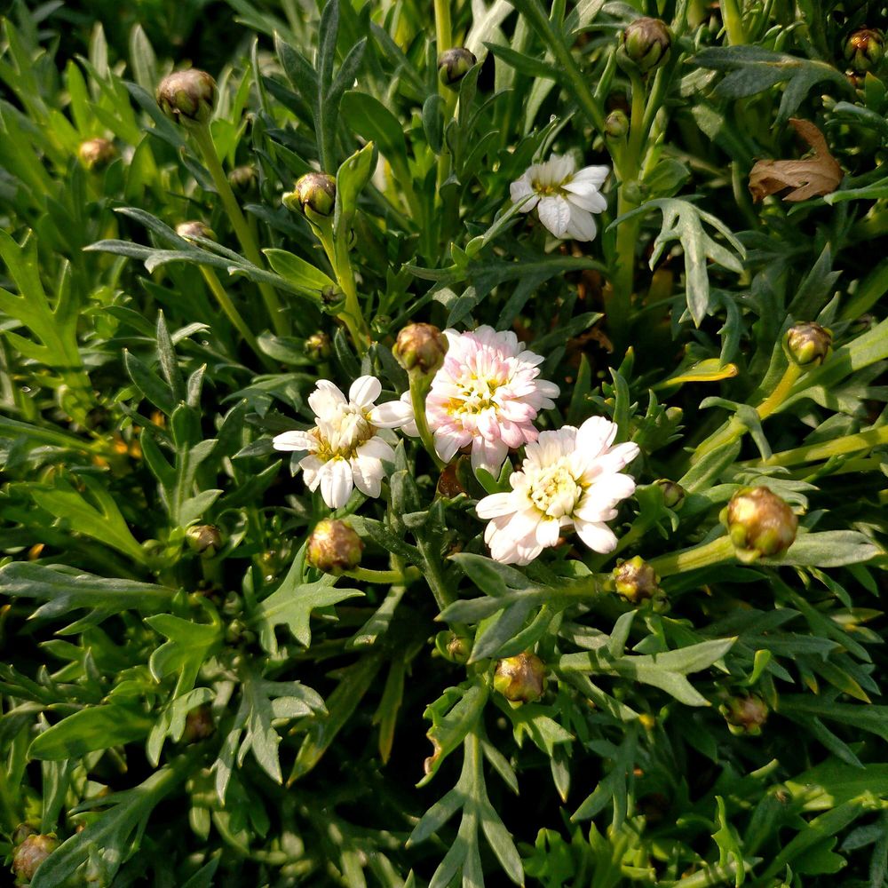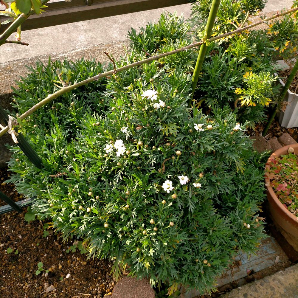 【5枚目】キク科繋がりで、そういえばクリサンセマム・パルドサムもありました。うちのはサカタさんのノースポールではなくタキイさんのスノーランドになります。こっちの方がお花が大きく株張り控えめなので、扱いやすくて好きです☺️