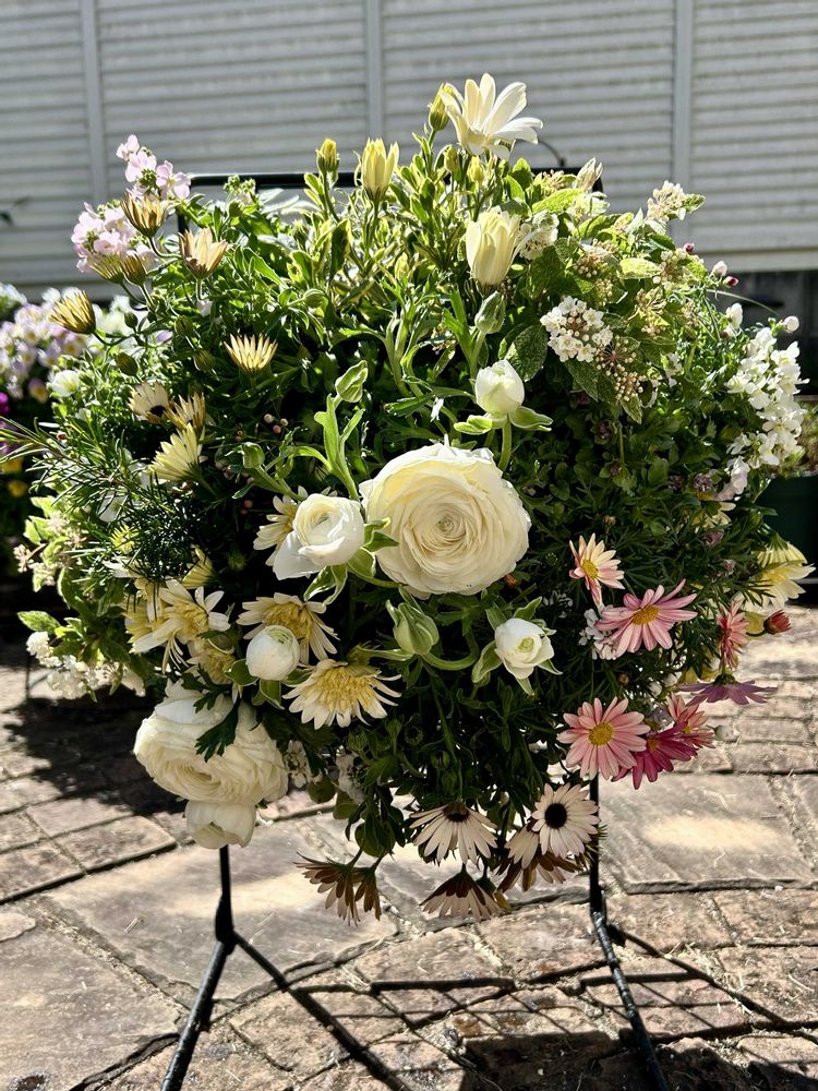 ラナンキュラス、オステオスペルマム、マーガレット、桜でまりなど30ポットくらいで作りました🌸