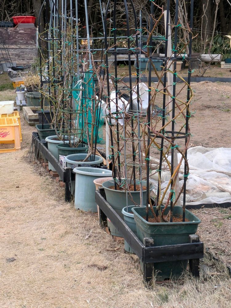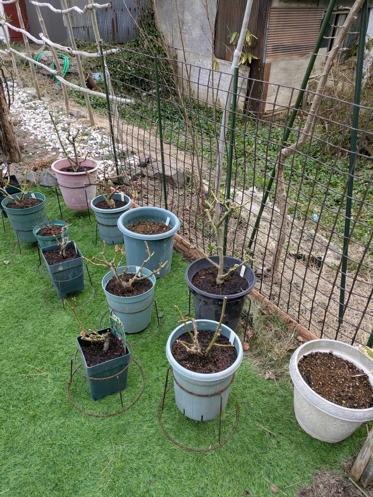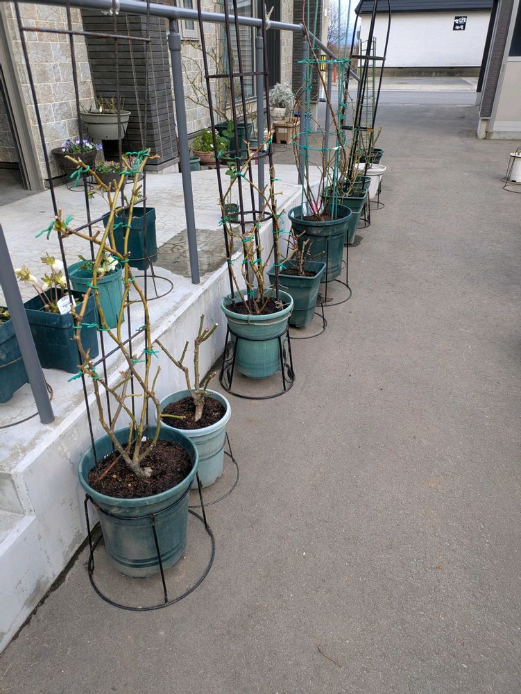 ようやくバラ鉢植えを定位置におくところまで終わりました👍梅である鉢植えを取り出し、🚿で洗い、根に活力を与えるというイエゲンと馬糞堆肥をいれました…ツカレタ…😩あと何年この作業できるだろうか😮💨地植えや、暖地ではないこの春の重労働💦