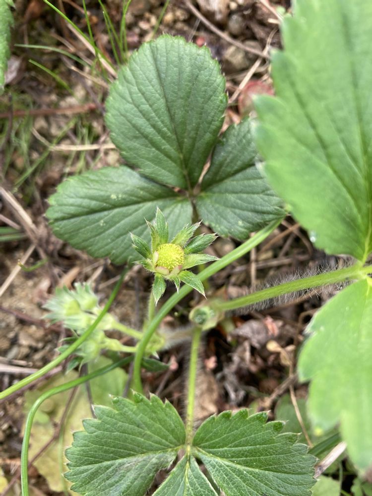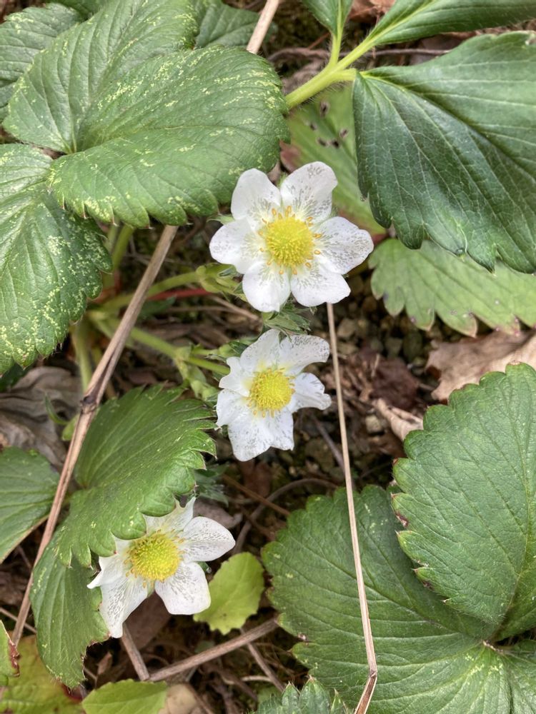 いちごの花 1番花は切り捨てて 2番花が咲き 実が出て来てます