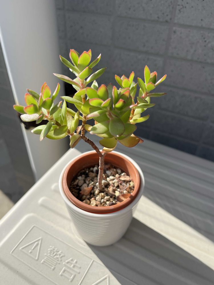 先月購入した謎の子(多分クラッスラ?)、どんどん赤くなっている!(1枚目が最新)