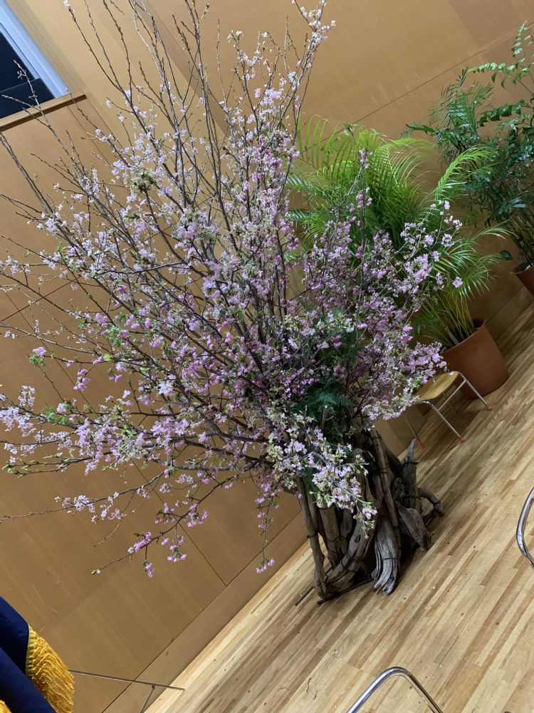 熊本テルサ メイン大ホール ステージ花 卒業式。種類の異なる桜を本番日に合わせて開花調整を行い 柔らかな色合いのコントラストの効いた桜の木を表現してみました。