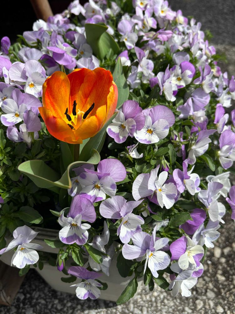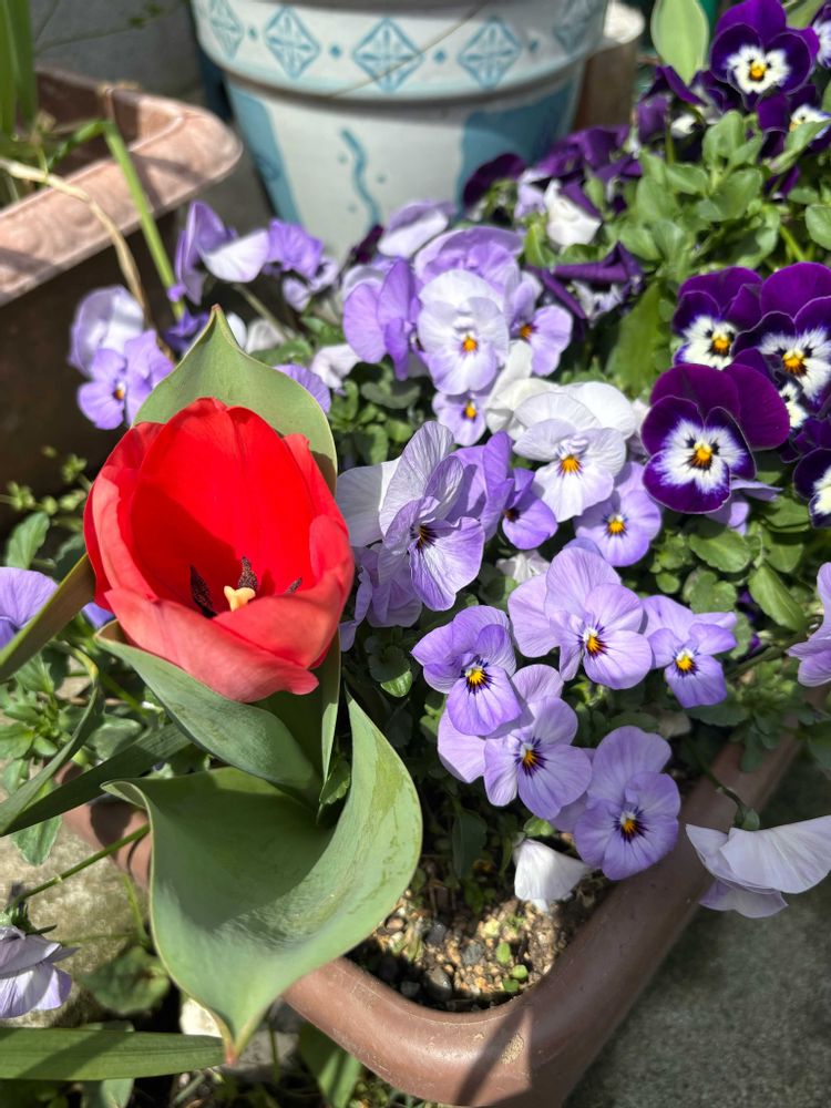 昨日は、白いチューリップ🌷🤍咲いたよ❣️日中の暖かさもあって今日は赤チューリップ🌷オレンジ🧡🌷咲いた咲いたチューリップの花が❣️😁🎉朝のお月さま🌙