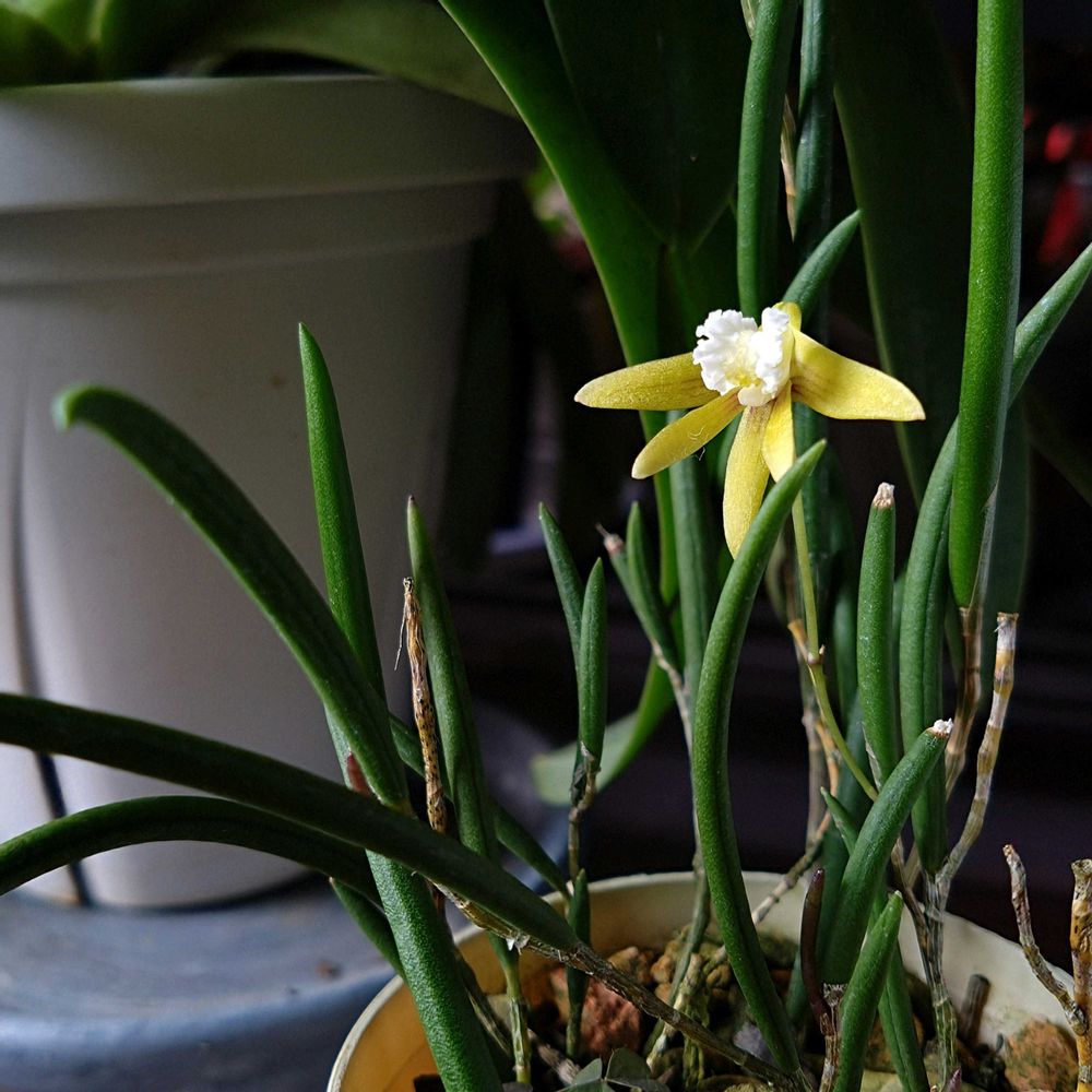 ①デンドロビウム ストリオラタ(旧ドックリリア属)こういう棒葉が大好きです(•ө•)💚