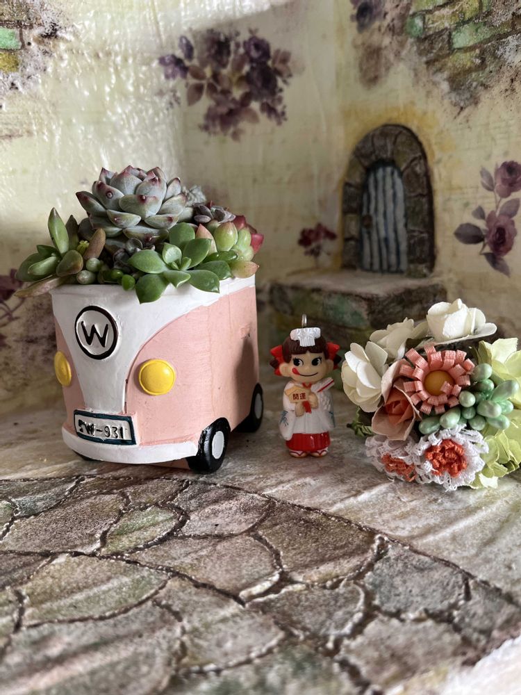 ①なつ子さんに頂いたモルタルスポットに🚗に寄せ植えと和服のペコちゃん❣️