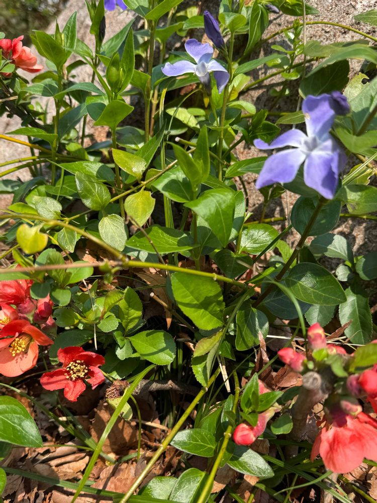 No.4. 陽だまりに、クサボケとニチニチソウが仲良くね🎶❤️🌿💜