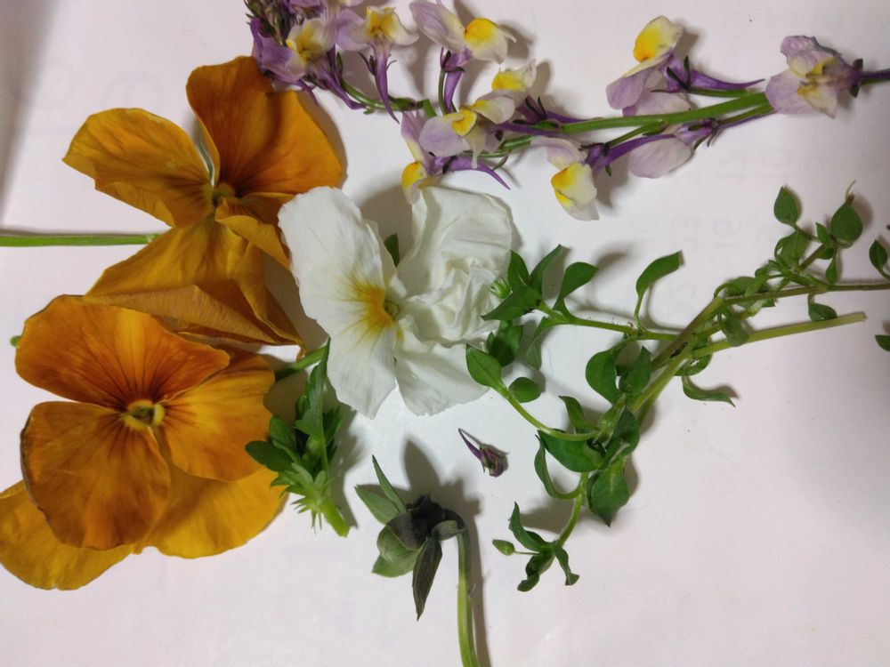 1⃣花殻摘みのパンジーと種子になりそうだった黄緑色の種、リナリアも開花していたのを半分の茎を折り室内で鑑賞