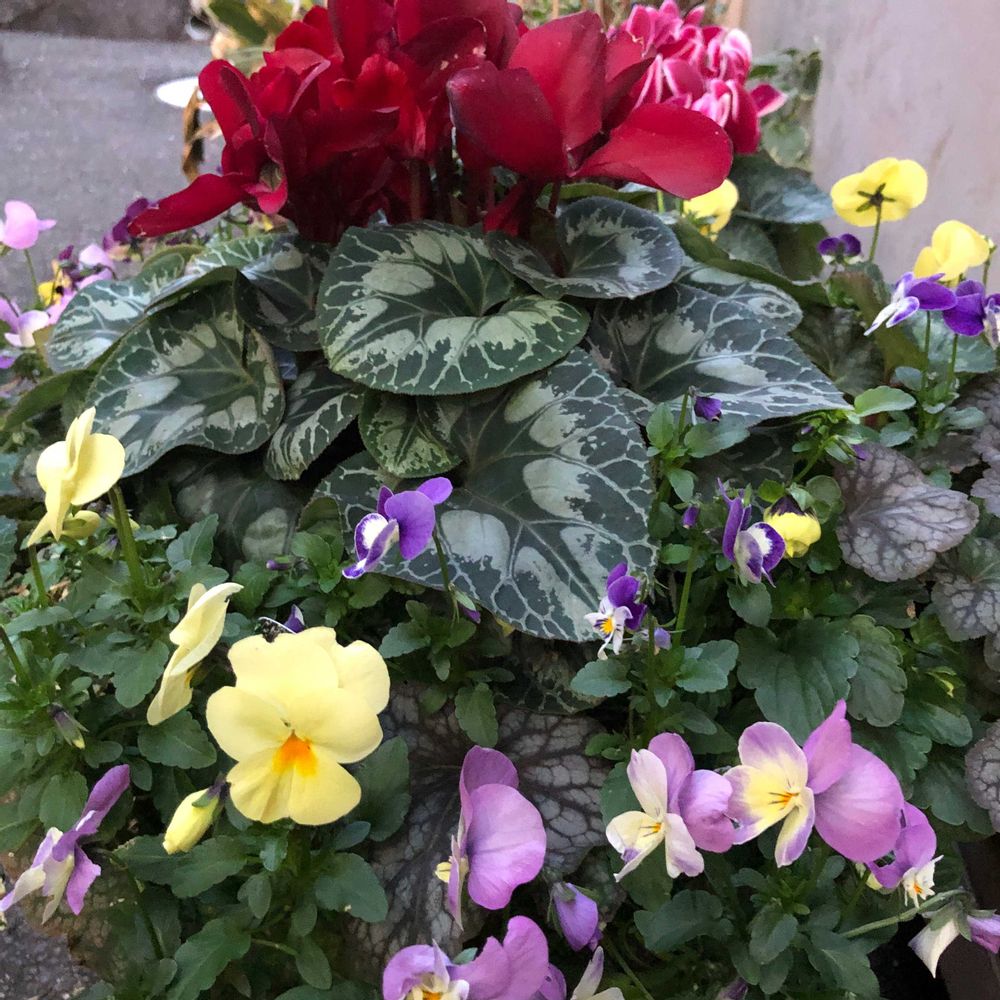 寄せ植え。シクラメン。とパンジーちゃん達、暖かくなり嬉しそう❣️