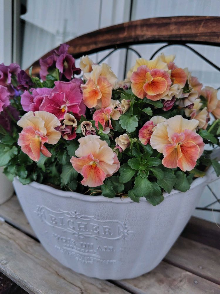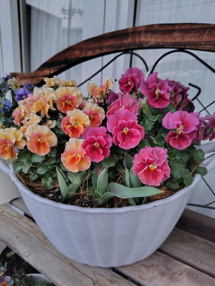 🧡🩷♥ビオラ シフォンピーチ2株とチューリップの寄せ植え