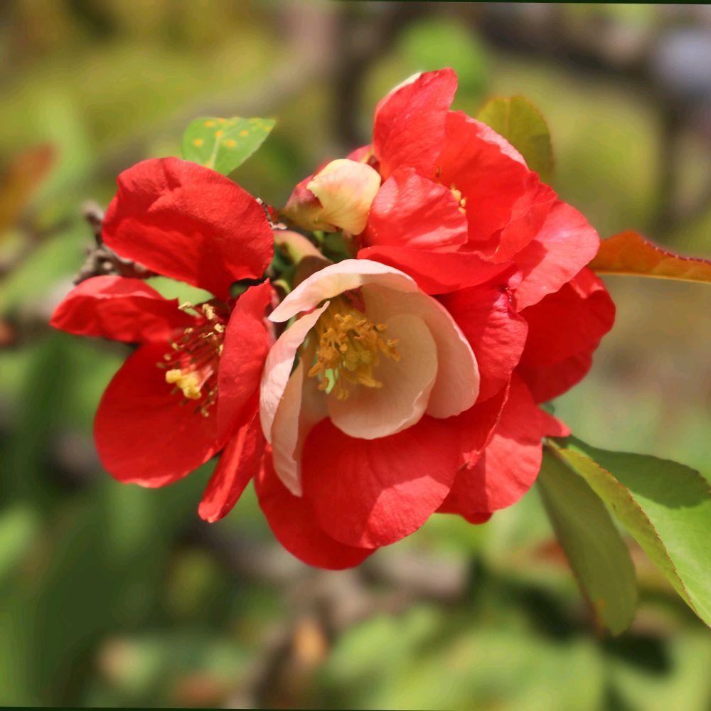 真っ赤なボケの花、真ん中の薄い色目の花が、赤を一層引き立てていて美しいですね。
