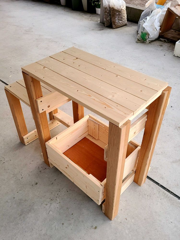 土曜に設計して日曜に柱だけハンズマンで切ってもらっていた外用の作業台、今日コメリで柱以外の木(いつも安い♪加工しやすい♪1×4材、ちょっとお安くなっていた2×4材)を買ってきて、一旦完成しました。ついでに大鉢を入れるためのキャスター付きの箱も作りまちた。