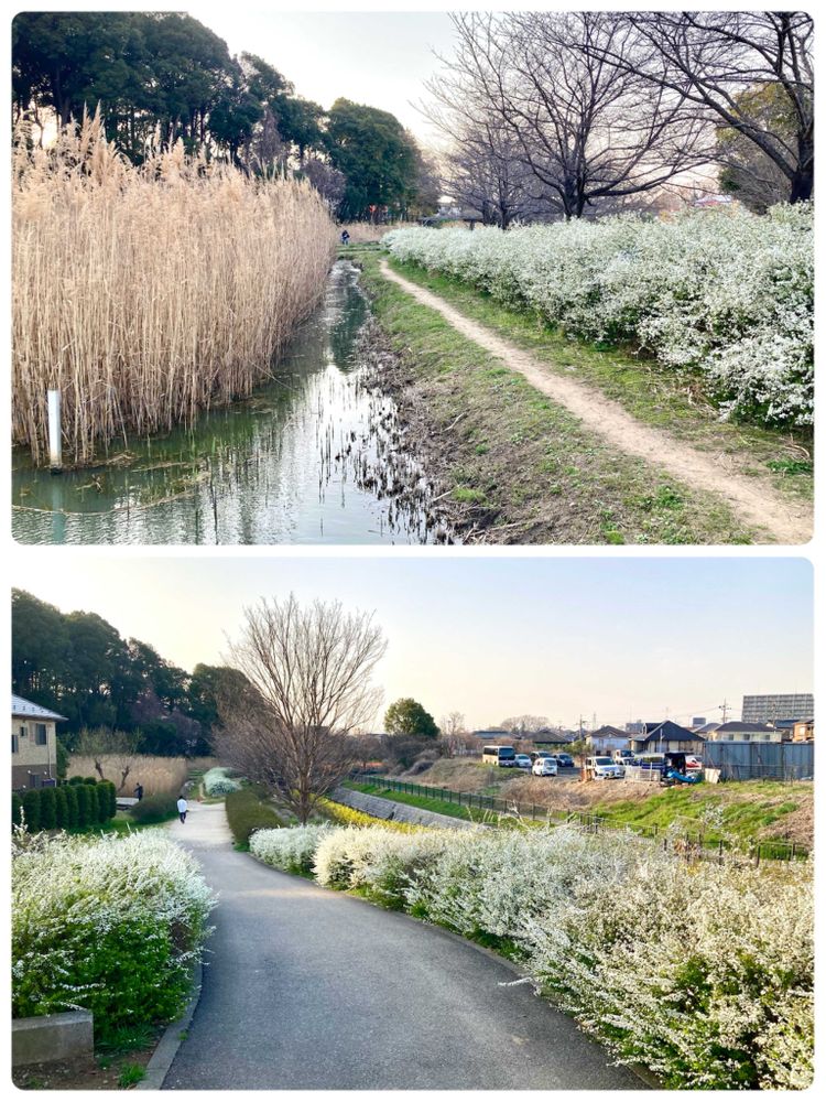 "根木内歴史公園"の入口が満開の「ユキヤナギ」でフラワーロードみたいだった。