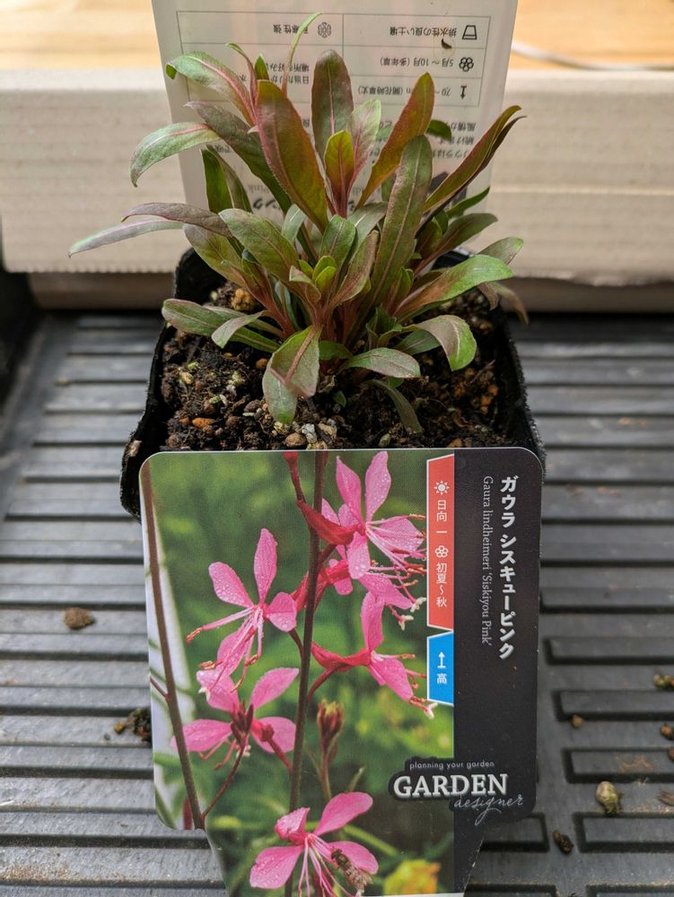 昨年種まきからの発芽に失敗したガウラ、今年は苗の植えつけに挑戦します。これはガウラシスキューピンクの苗です。
