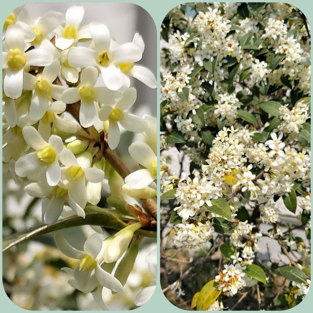 「ギンモクセイ(銀木犀)」の花が咲く季節は、9月〜10月。金木犀よりも若干遅いが同じ時期。しかし、「銀木犀」は、さらに1シーズンに2〜3回花を咲かせたり、秋🍂以外の季節に咲いたりします。「銀木犀」の花が春や冬に咲いているのを見かけるのはこのためです‼️🤗
