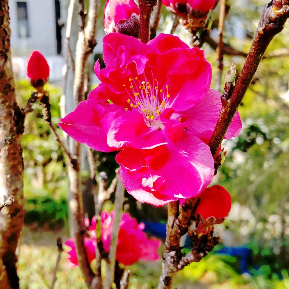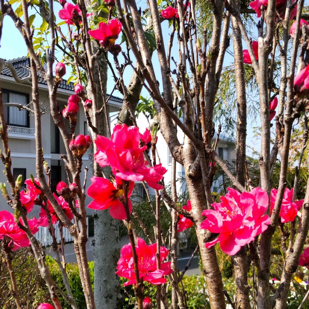 小さな庭の中央に 広がらないように…と, ほうき型に育つ花桃🌸