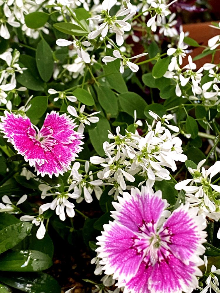 ④寄せ植えのナデシコ(前回投稿2.13)は赤紫色の花びらにギザギザの切り込み…白色の縁取り入りのグラデーションが綺麗なナデシコです💕🥰品種名はわかりませんが⁈パープルピコティによく似ています😒🌿🩷🤍🌿こちらも次々に花を咲かせています💕💜🤍🩷