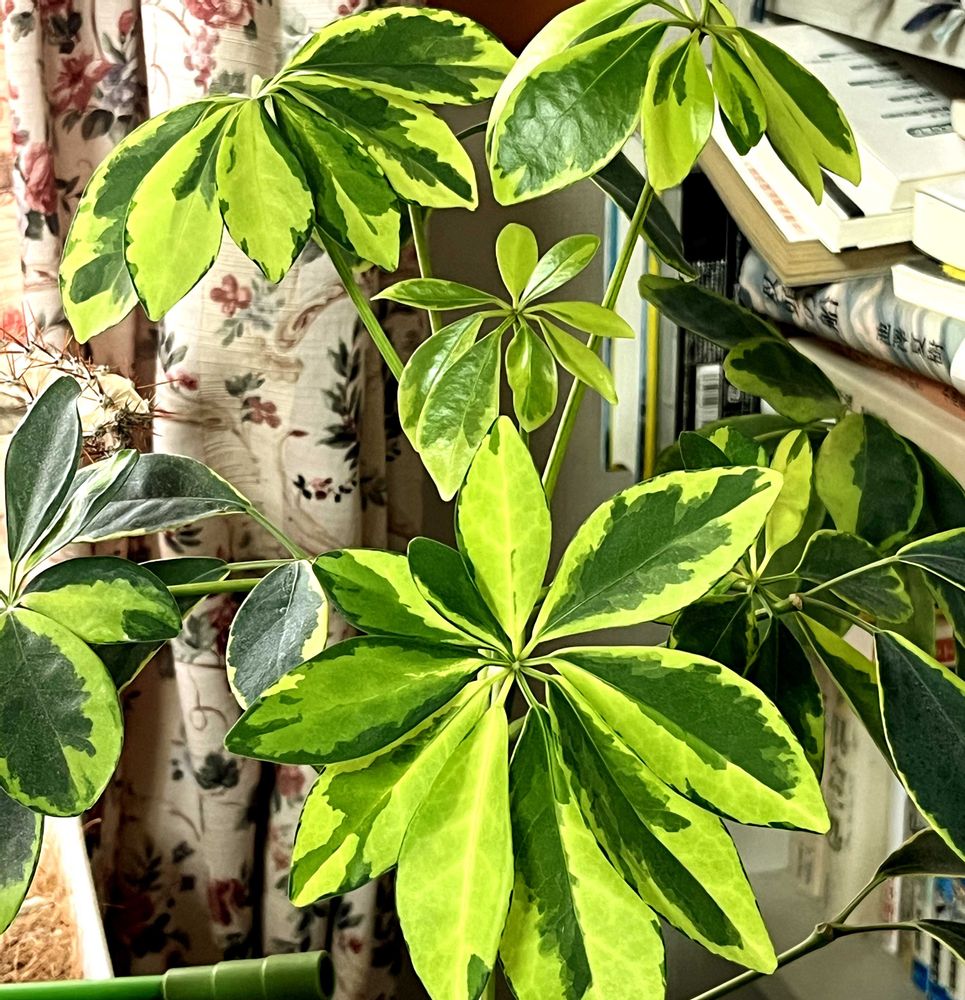 窓際🪟の*班入りシェフレラ*赤ちゃん葉っぱ🌿も可愛いです❣️ お水をあげすぎないように*°♡ これからも元気にね💕︎
