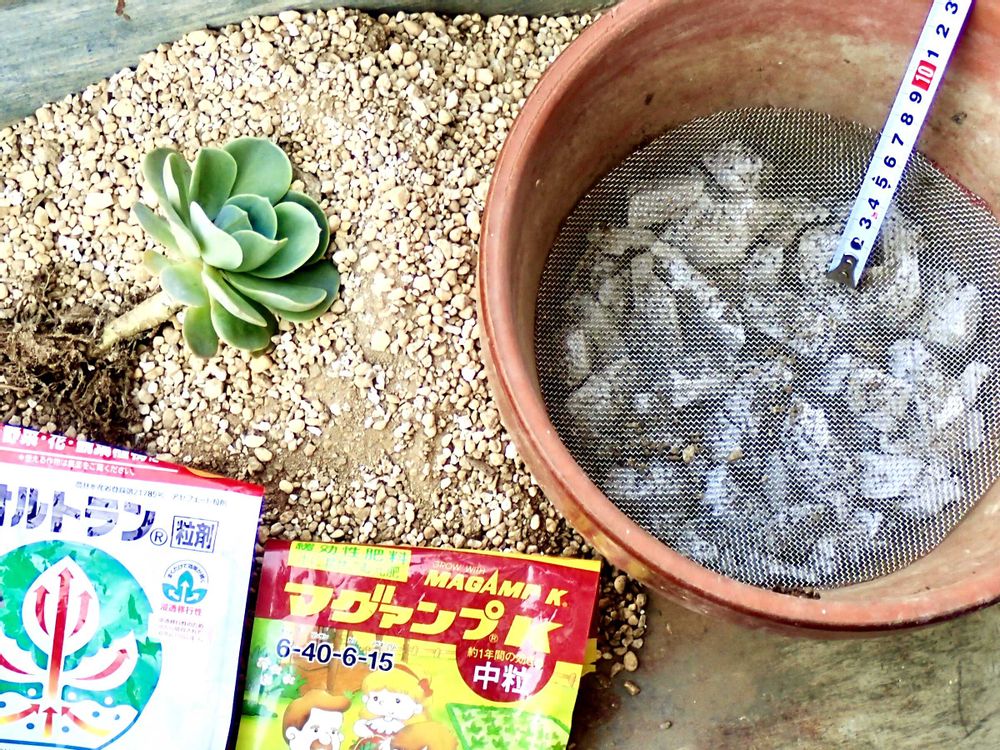 七福神の植え替え ①7号鉢 ②10cm 七福神の根が蒸れないようにするため 水抜けと乾きやすい土を使用 (サボテン用土赤玉土)オルトラン マグァンプkをブレンド③ステンレス網 ④6cm発泡スチロールを粗めに使用 七福神を高温多湿で2度失敗🥵 3度目の挑戦