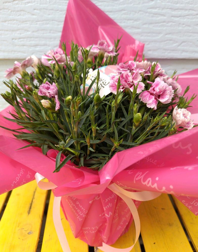 子ども、孫、ひ孫総勢20人以上からのメッセージカードやプレゼントと一緒に、カーネーションの鉢植えを入所する介護施設に届けて来ました💐