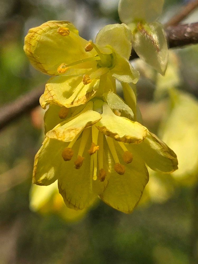 ヒュウガミズキは近畿地方(石川県から兵庫県)の日本海側の限られた地域の岩場に自生している、樹高1.2~2mの落葉低木です。花は、葉が出るよりも早く3月下旬に2~3個の丸みのある黄白色の小花が花序になって、数多く下垂します。枝は細くたくさん分岐し、半球状の整った樹形になります。刈り込んで樹形を整えることが簡単にできるので、樹形づくりを楽しむことができます。