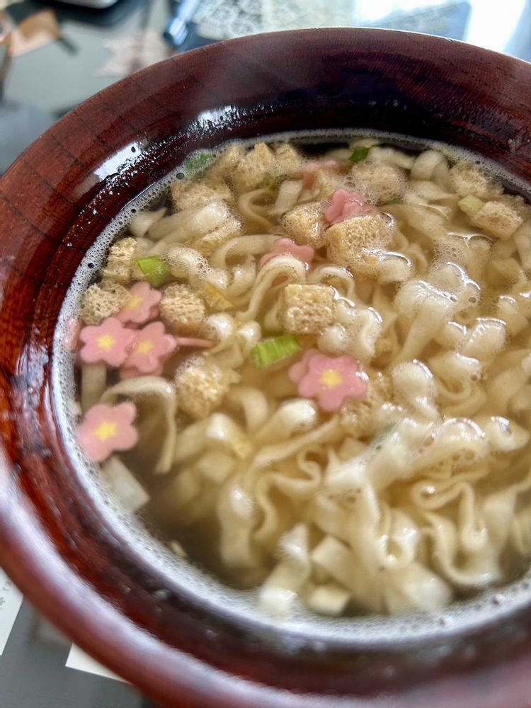 2枚目は在宅ワークのお昼のお供。お椀どん兵衛にはかわゆい🌸カマボコ。