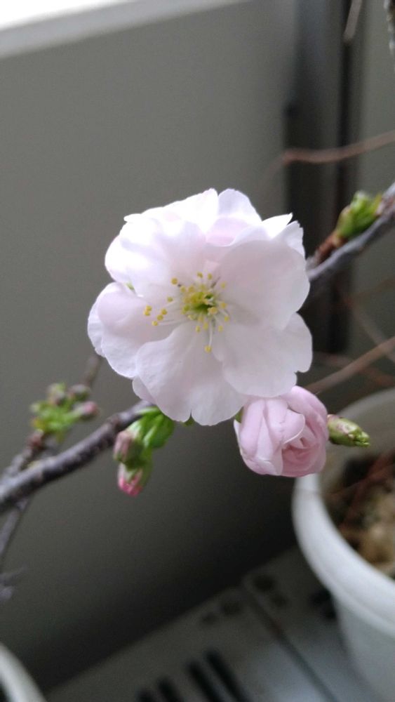 最近の暖かさで急につぼみが膨らみ、赤みも見えていたのですが、今朝、早くも一輪咲いてくれました(^o^)