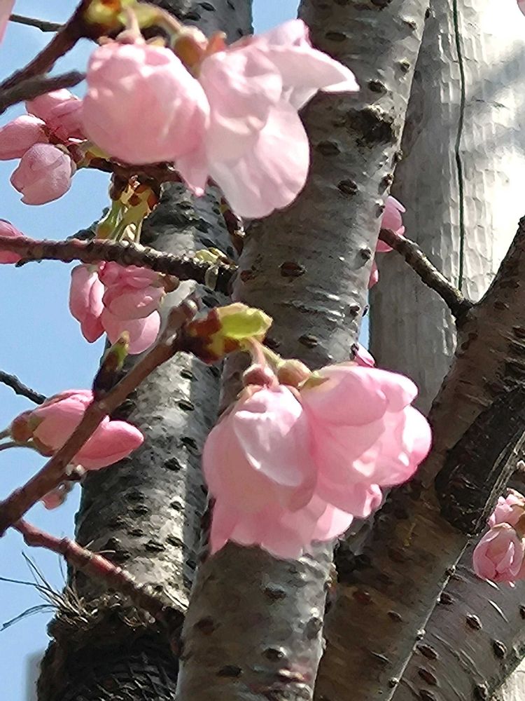 3枚目はこのところの暖かさで一気に咲いた少し離れた所の桜です。土手に下側向きで生えているので…近くの枝を見つけて撮りましたが下手っぴですみません💦