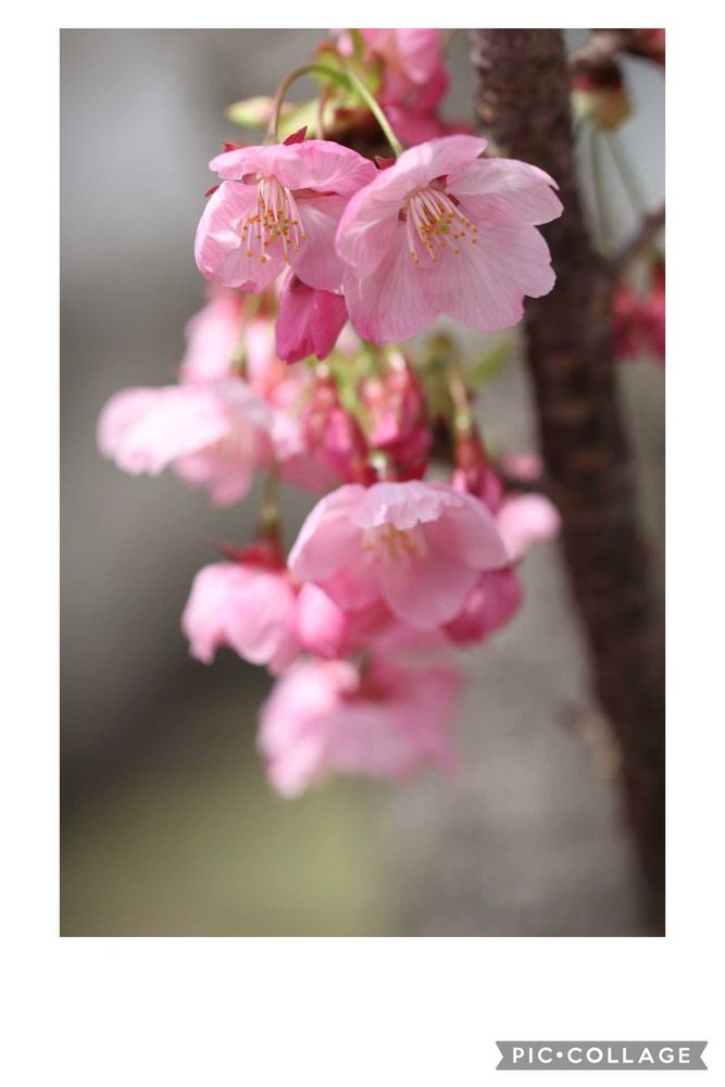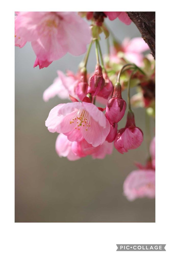 陽光桜の目にキラやかな濃いいピンク色のうつむき加減の可愛い花🌸