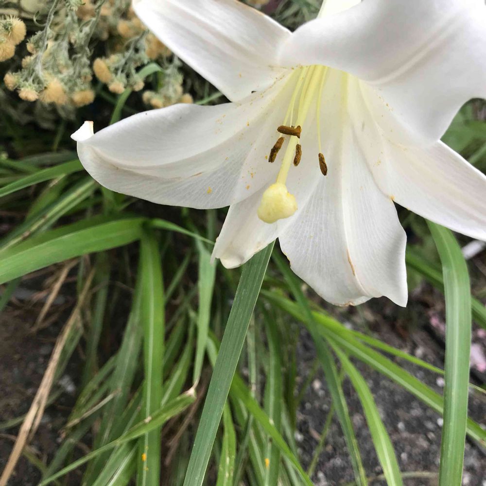 葉っぱが写っているものと同じくらいの細さで花が真っ白ならシンテッポウユリ、もっと幅のある葉っぱならテッポウユリかと思います。