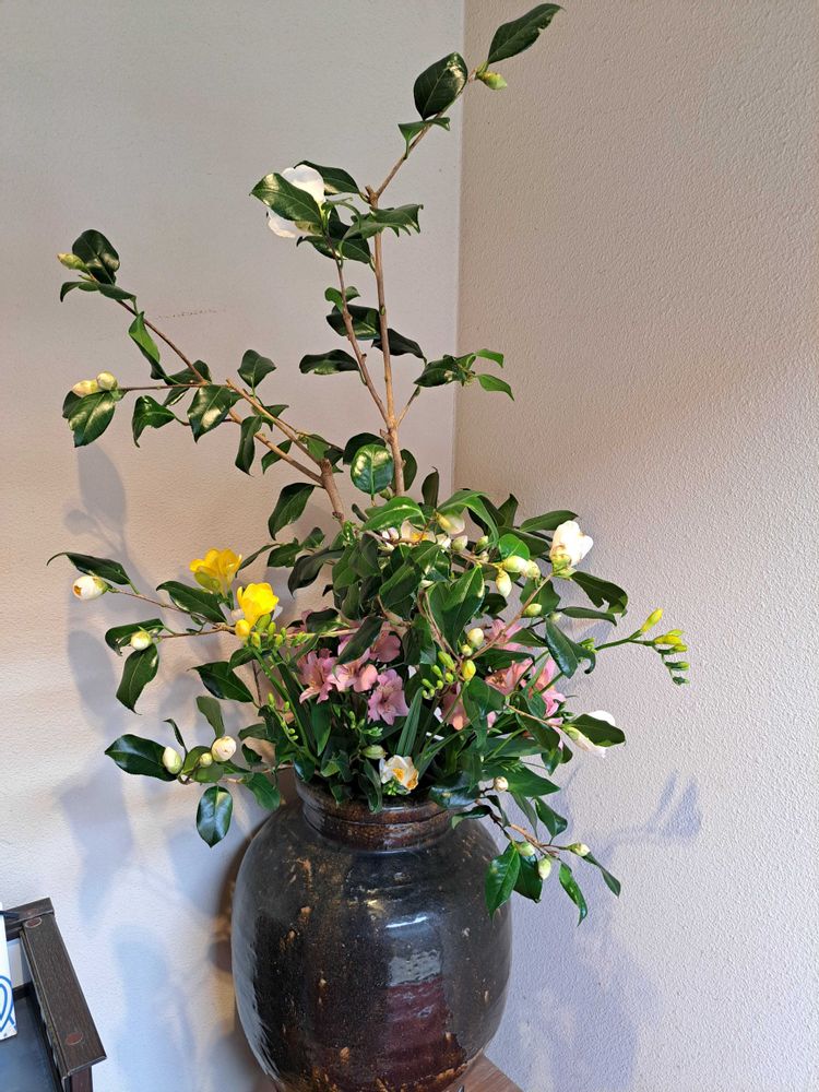 椿の花に、フリージア、アルストロメリアでしょうか‼