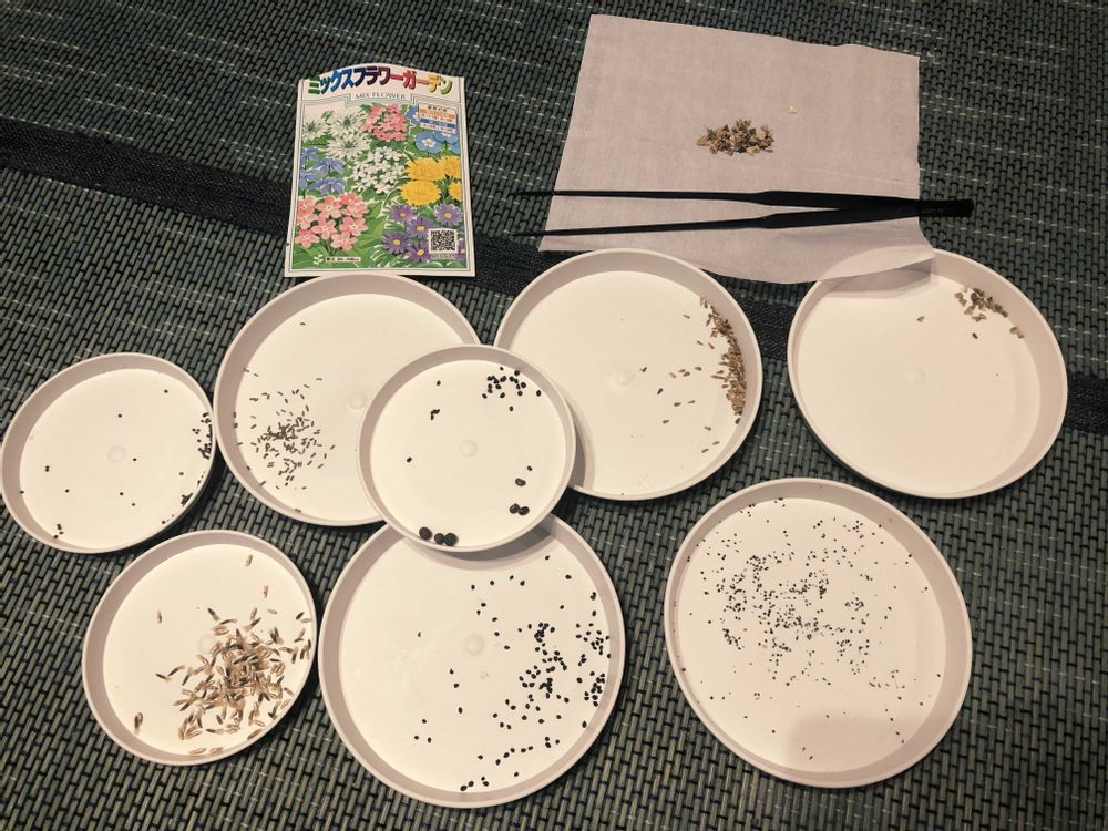 ミックスフラワーの中身を大体で分けて、種類を調べて草丈で蒔いてみました。が、空いてる場所も草丈高い花の種を蒔くので結局ワサワサになりそうです。