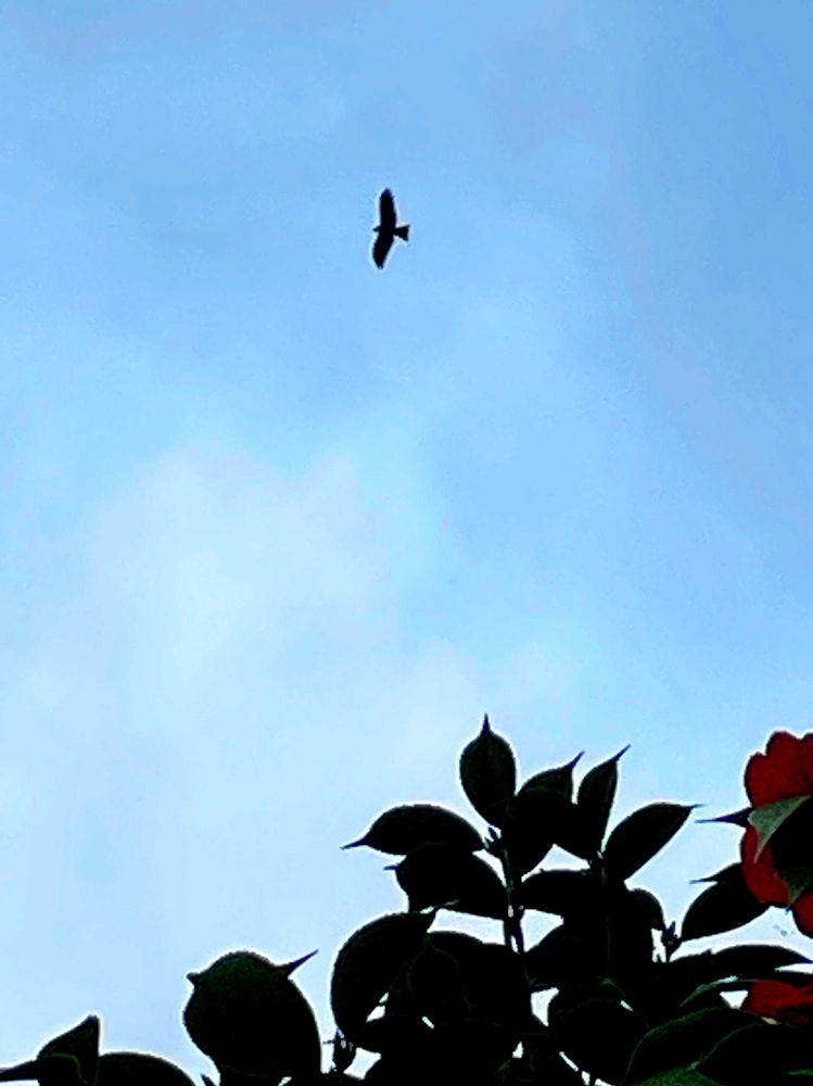買い物帰りに,通り道のお宅の樹木,椿の花と鳶の投稿画像