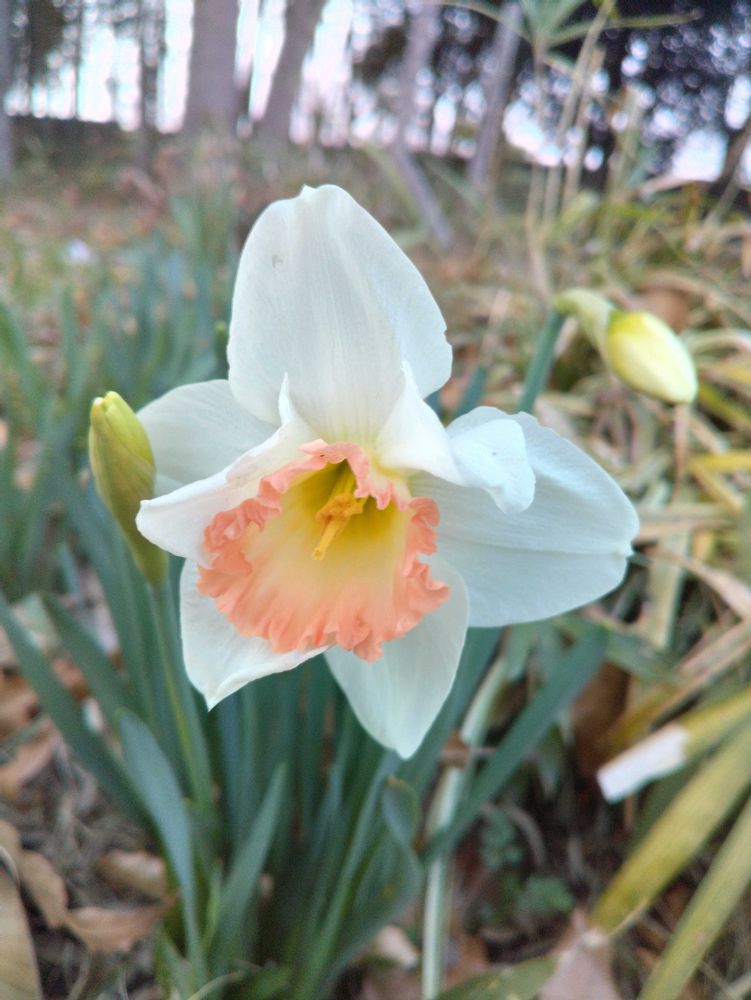 真ん中が優しいオレンジ色の白い水仙🤍🧡🤍
