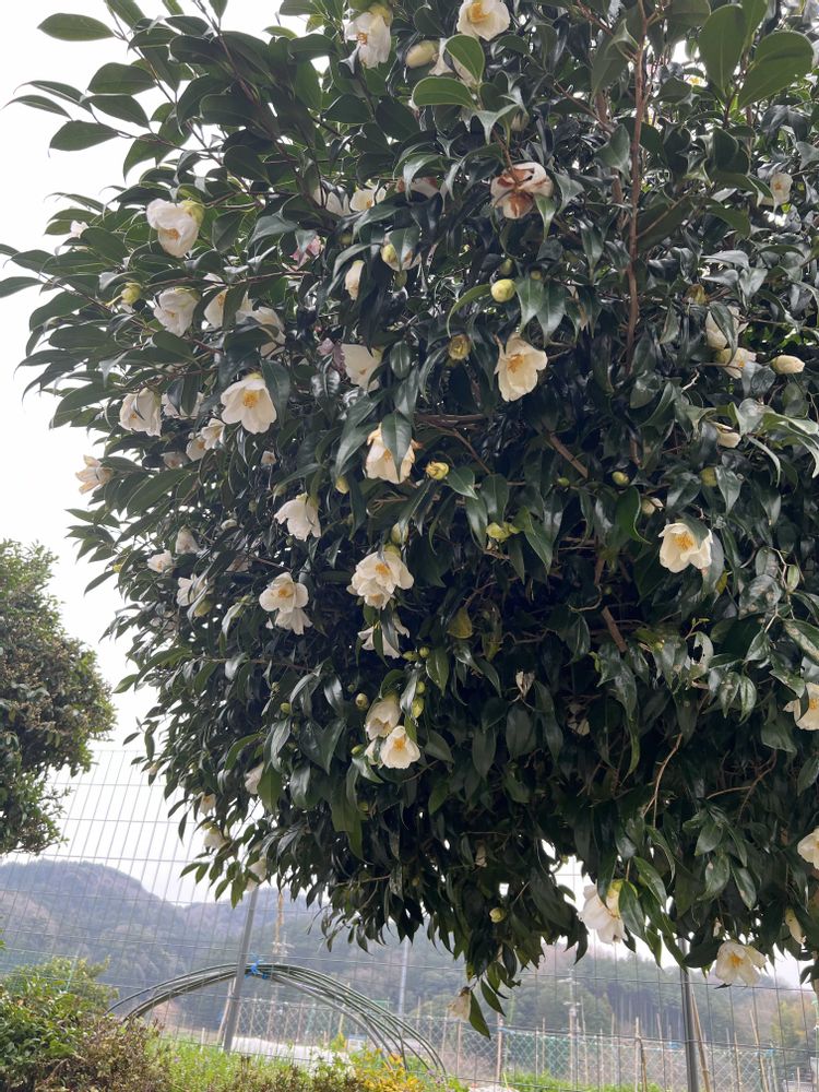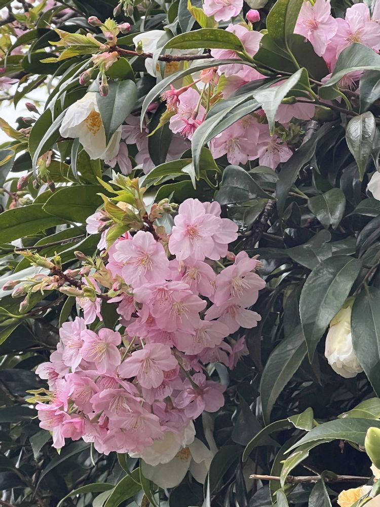 白椿が一重と八重咲きが2本並んでいて、間に早咲きの桜が隣の白椿の間から顔を覗かせていました