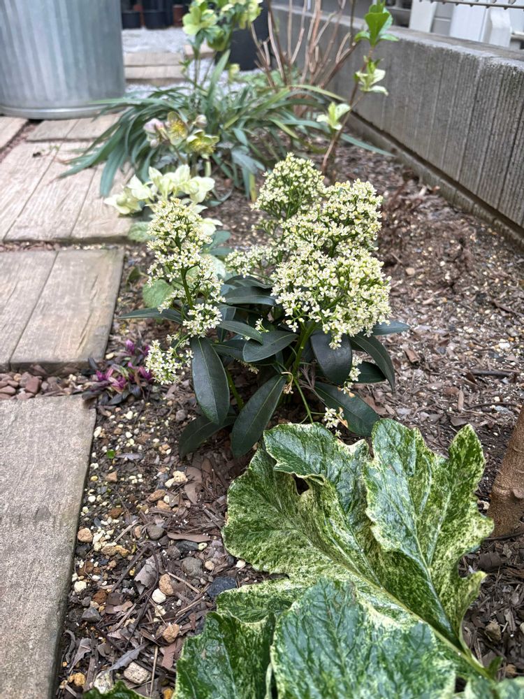 12月に植えたクリスマスローズとスキミアが、この明るめな日陰でとっても可愛く咲いてくれてお気に入り 。夏越し上手くできると良いな…