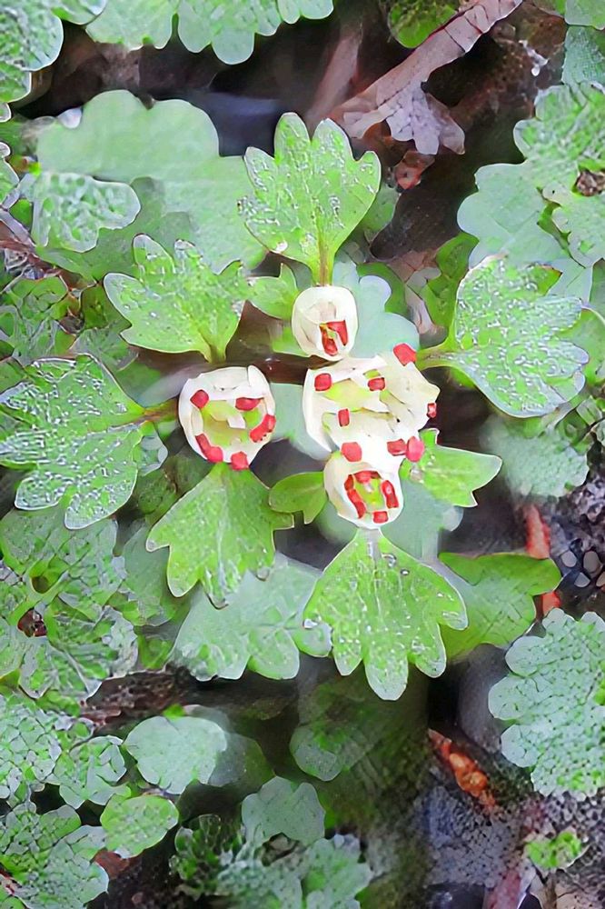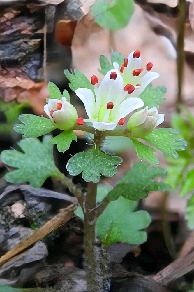 高尾山のハナネコノメ、白い萼片に赤い葯が可愛いです🔴🤍🌿