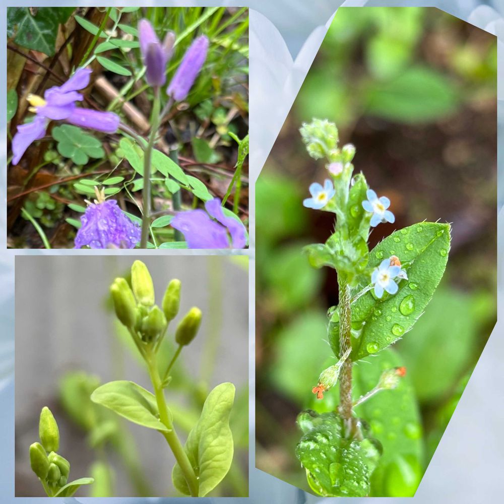 ↑我が庭には貴重なちっちゃなちっちゃな紫花菜💜↓小松菜🥬から花芽が、、これはもしかして菜の花みたいな花が咲くのかなー?🤔💛🌼→わすれなぐさにとても似ている雑草さん。(キュウリ草だそうです、マロママさんありがとうです〜)