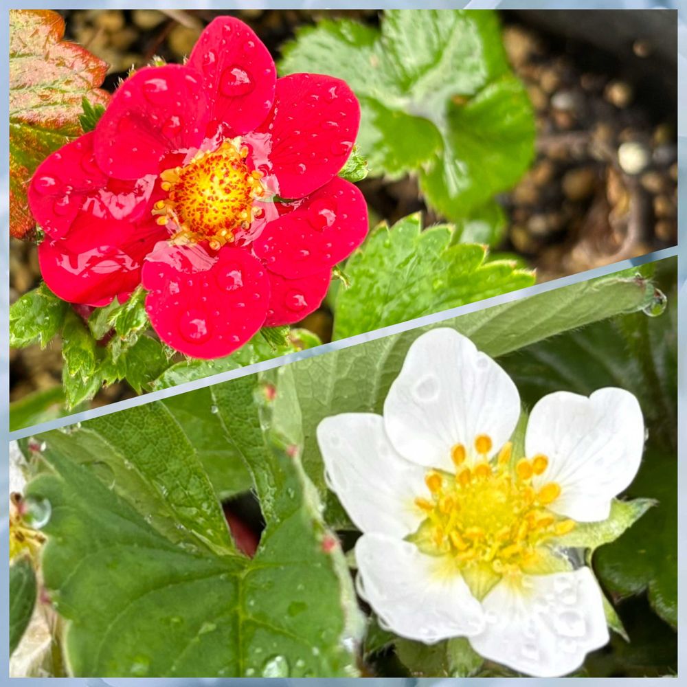 春雨に濡れて☔️1️⃣今年も何とか紅白揃いました。🪴🪴👏👏❣️赤いお花のいちごさんとお局ワイルドベリーさん。2️⃣流石に長寿のシロバナさんの方はモリモリしてます。いちご🍓の子供ができてる😳❣️