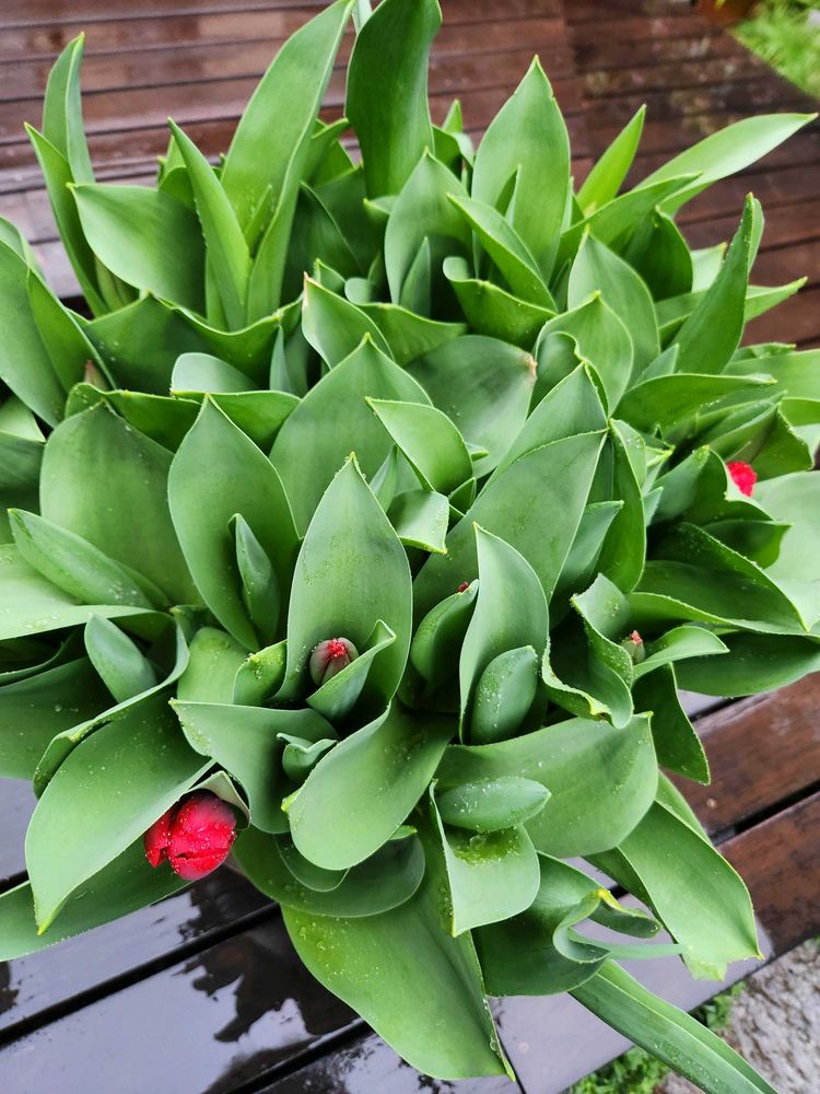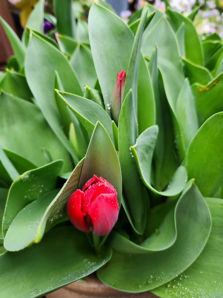 ダブルデッカー植えのチューリップが真っ赤なお顔を見せてくれました。❤❤💚💚