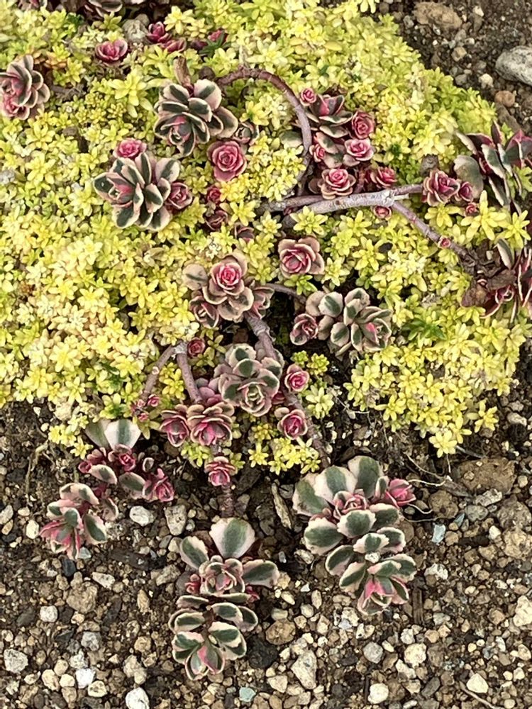 新芽のピンク🩷がバラみたいで可愛いくて♡黄緑色のセダムとの寄せ植えからピョンピョン飛び出して元気ですね♪🎶