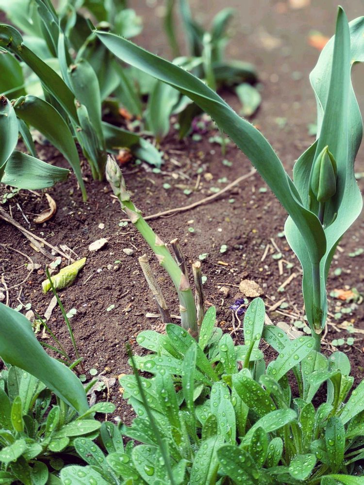 春の草花の間から1本だけ伸びてきたアスパラガスの芽。3年目でやっと収穫できそうな太さになりました。さっと茹でて食べようと思います。