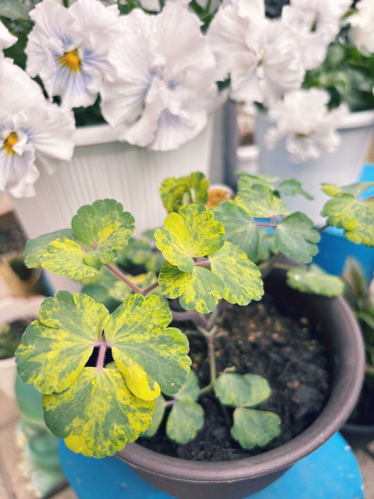 斑入りのオダマキとワイヤープランツ、可愛い🩷