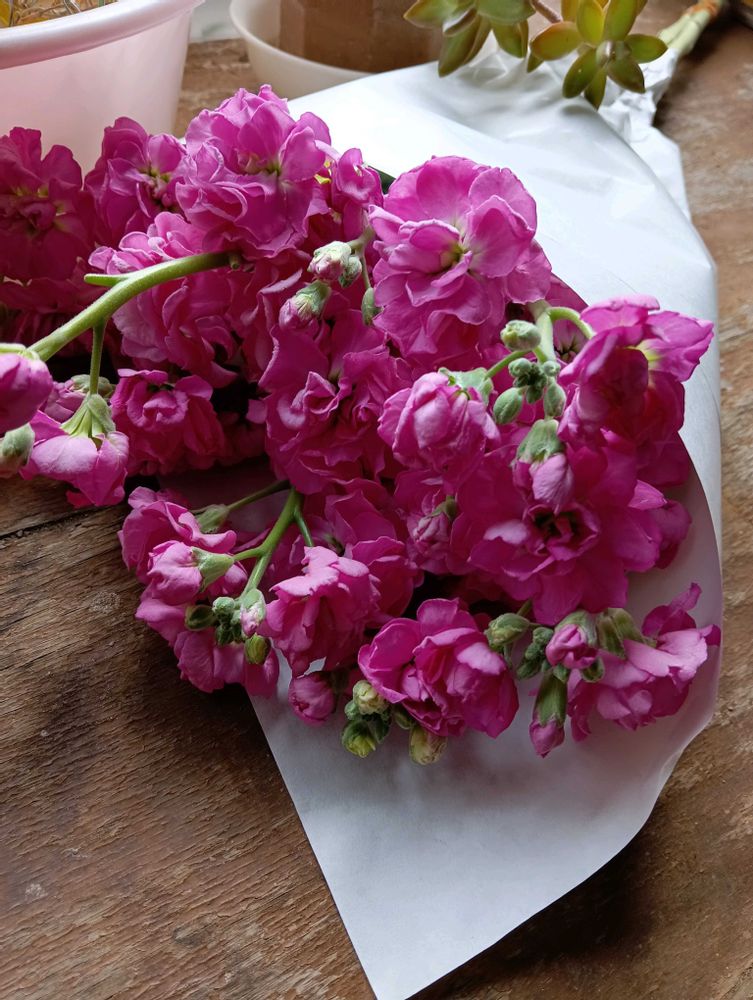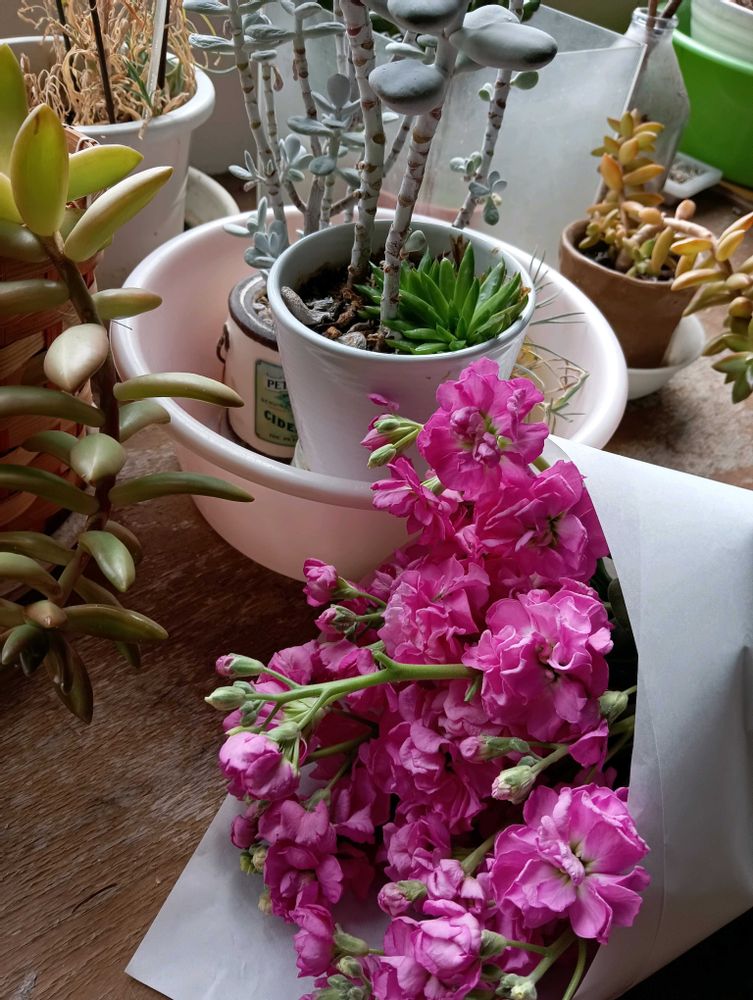 下町散歩の花屋さんで良い香りのストックを買いました💖可愛いワンちゃんにあいました😄