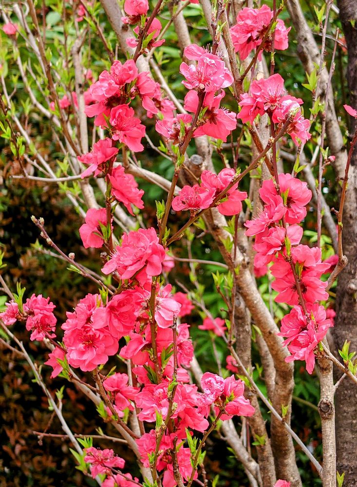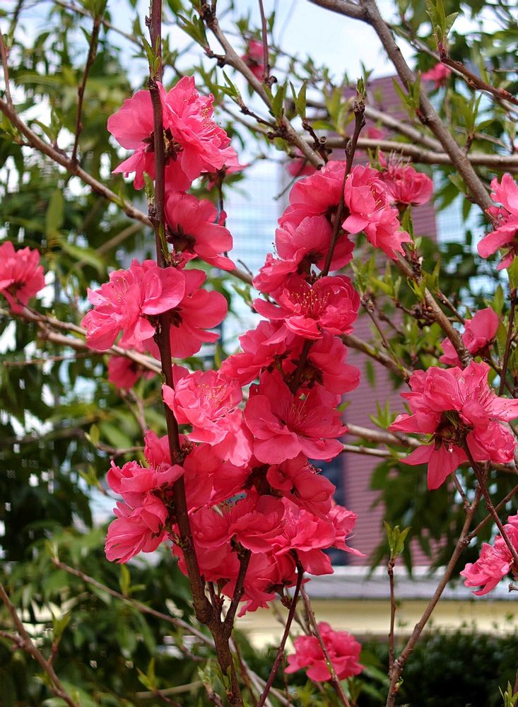 今日の昼休み、近くを散歩途中に見かけた赤色の桃の花。