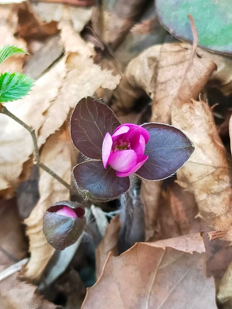 ピンクの蕾の雪割草の後ろに芽吹いているのは、イチゴでしょうか😊