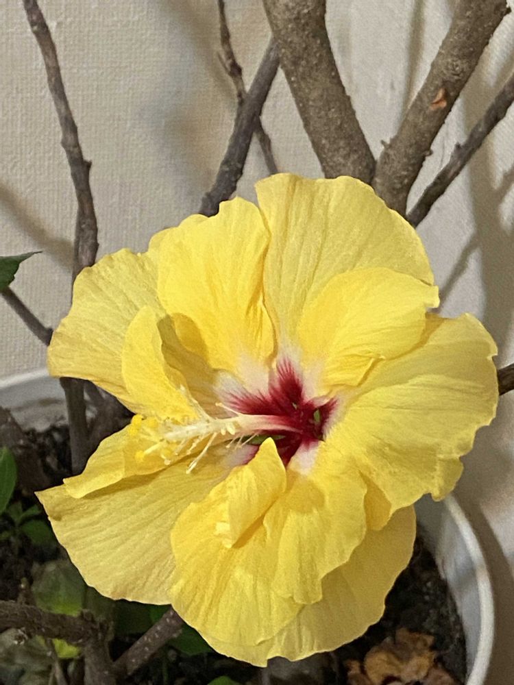 休眠中?なのか葉っぱも少なくて枝が丸坊主になってるのに、一輪だけポツンと咲いてました〜💛