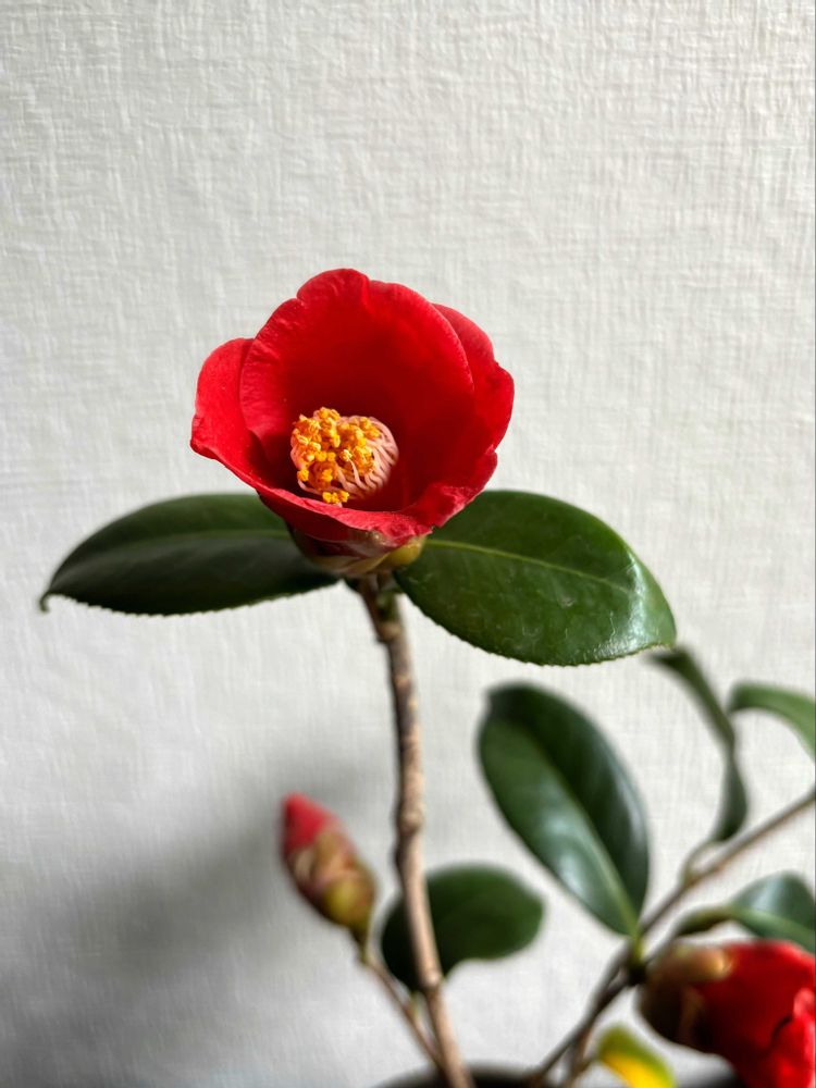 ここ数日の暖かさで椿が開花。花がスッキリシンプルなシルエットで大変自分好み。お迎えして良かった