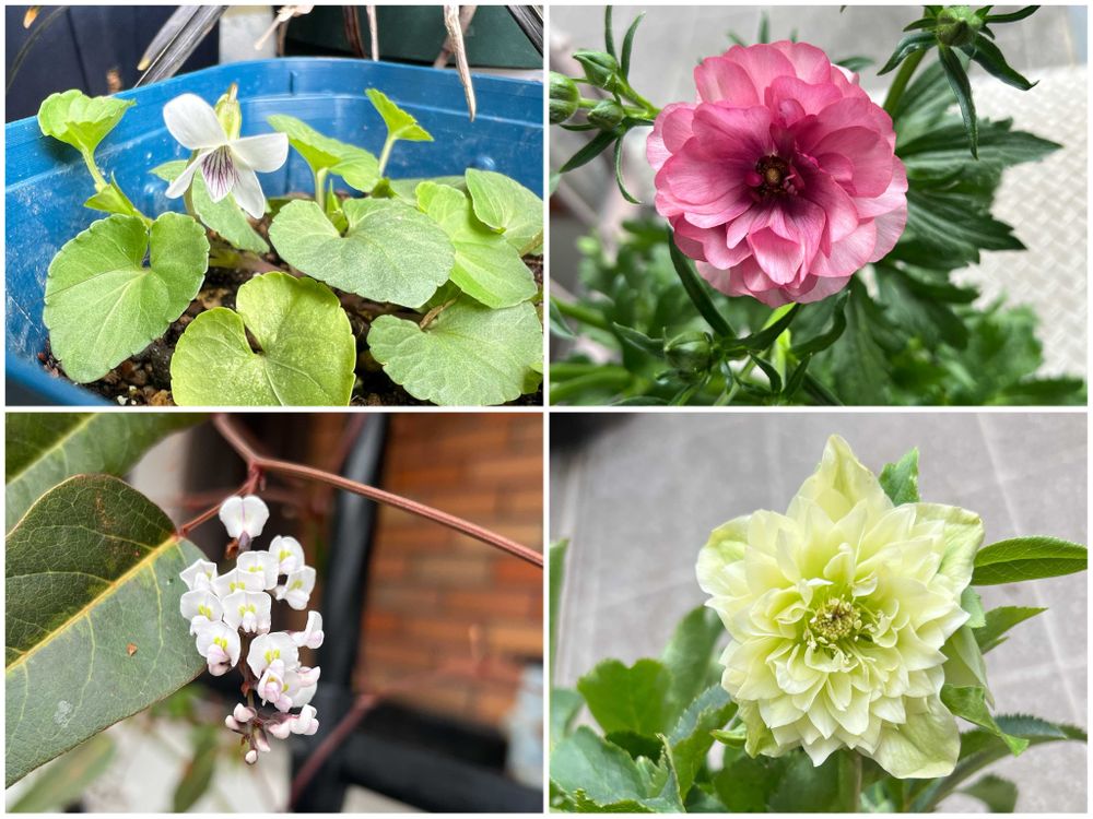 で、1枚目の左上は、昨年にネットで買ったオダマキ、のはずが、なんか思ってたのと違う花が咲きました。残念な気持ちはありつつも3号ポットと小さく邪魔にならないので、そのまま1年以上育ててました。最近、皆さんのGSの投稿で気づきましたが、これはスミレですね。
