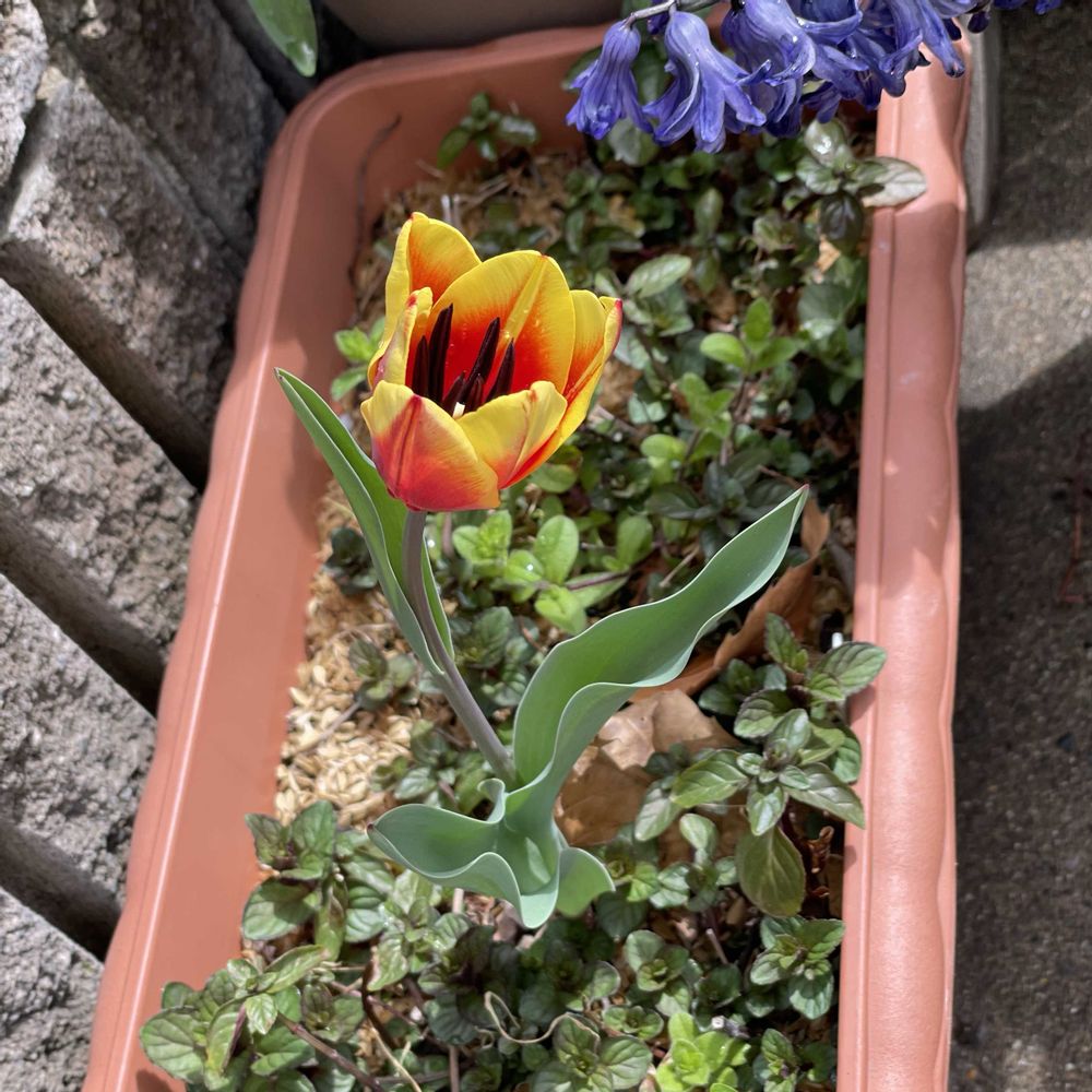 土を再利用したハッカのプランターからチューリップが咲きました🌷薄荷特有の刺激臭に負けずに花を咲かせてくれました。びっくり